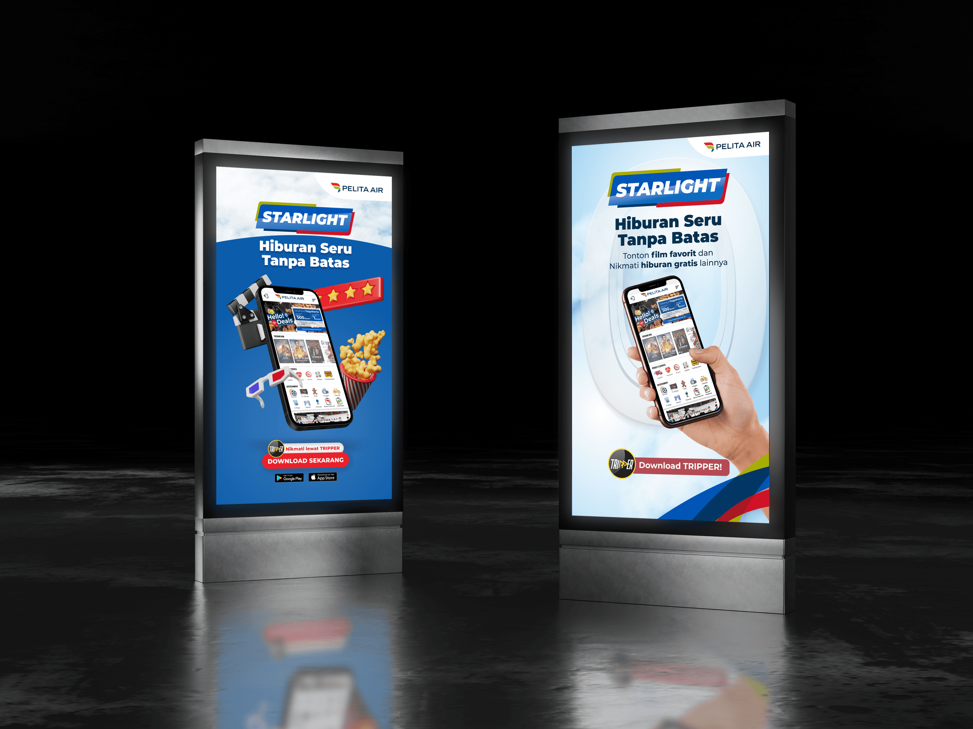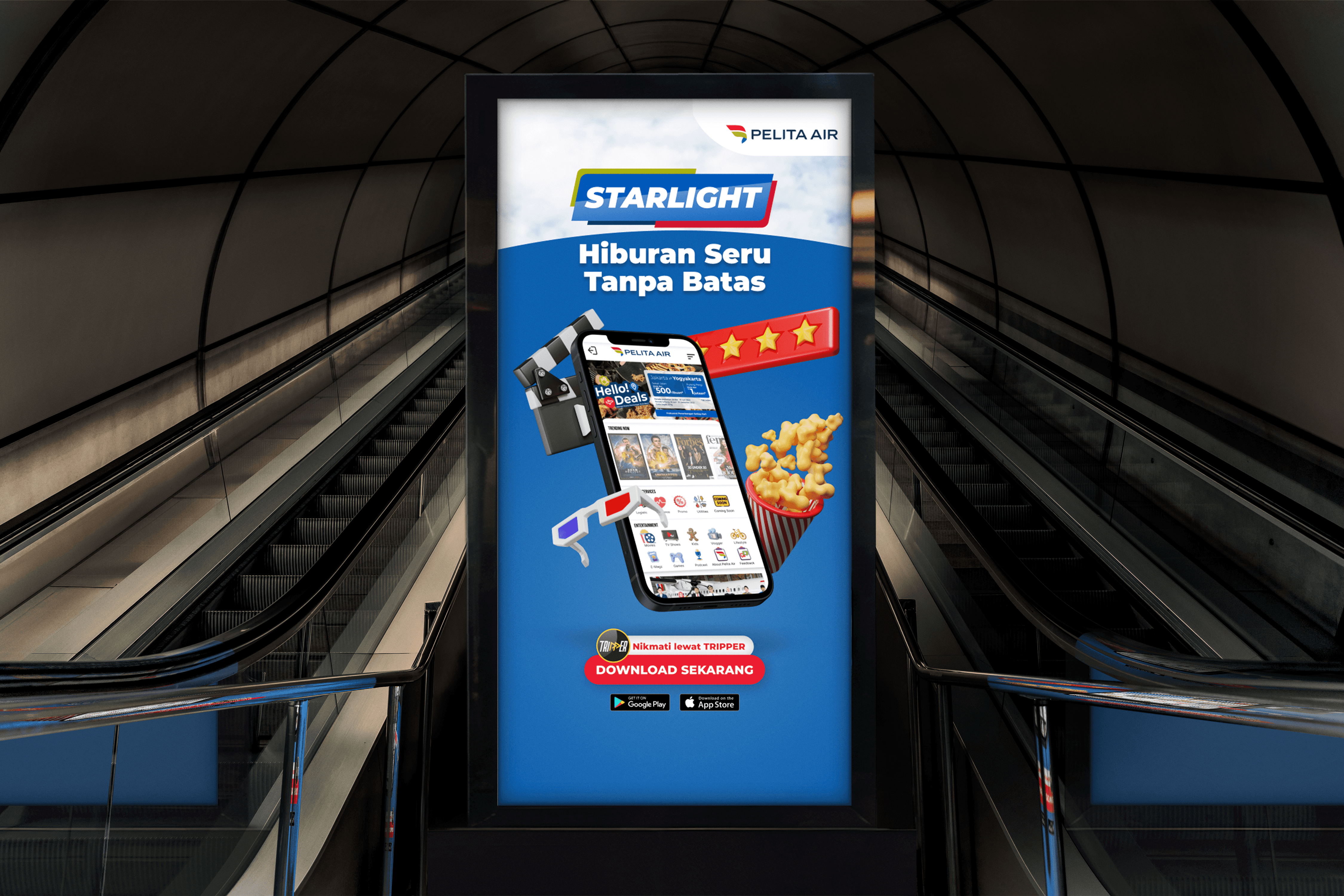A promotional campaign for the "Tripper" app, Pelita Air’s in-flight entertainment and service platform. The visuals were designed to highlight the app's features and ease of use during the flight experience.